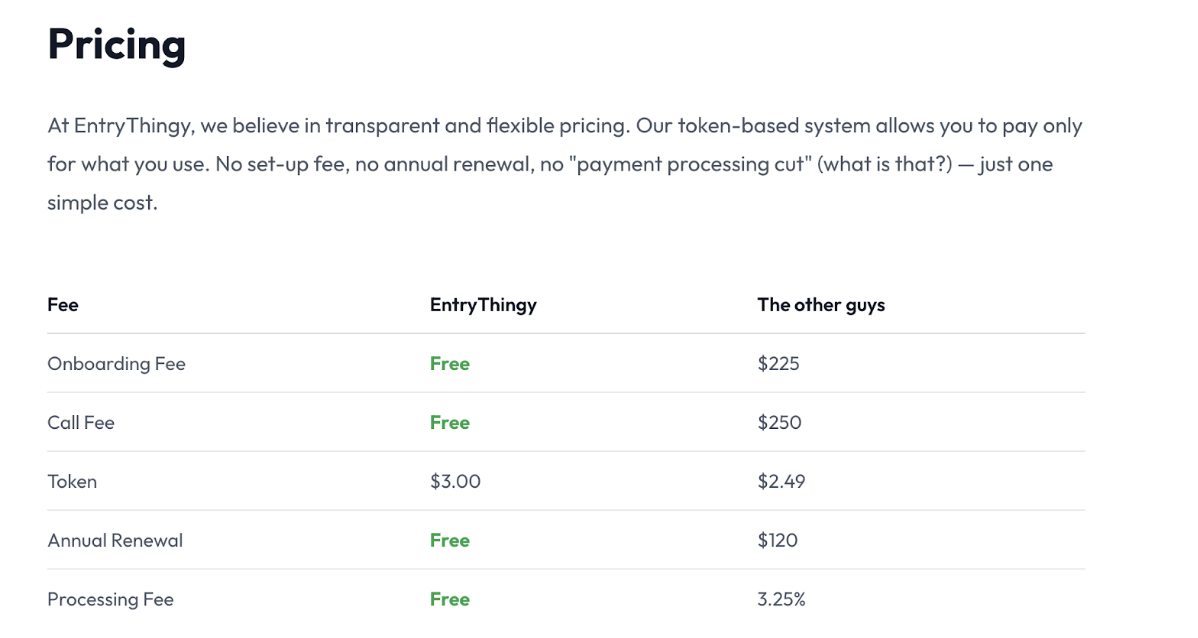 Instead of taking a cut of your revenue, EntryThingy uses a straightforward token model: